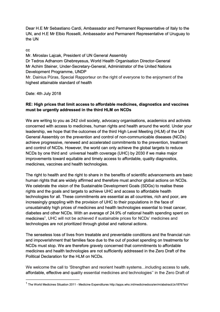 242 membres de la société civile, organisations de défense, universitaires et militants concernés par l’accès aux médicaments, les droits de l’homme et la santé dans le monde entier lettre sur les prix élevés qui limitent l’accès à des médicaments, diagnostics et vaccins abordables doivent être abordés d’urgence dans la troisième réunion de haut niveau sur les maladies non transmissibles